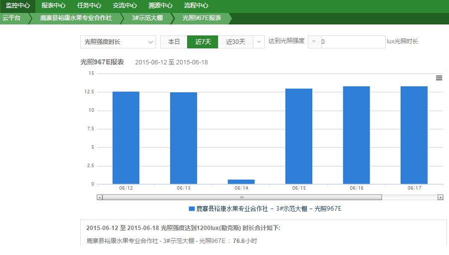 天潤智力智能農(nóng)業(yè)云平臺可以全面監(jiān)測葡萄所受的光照強度,以此來判斷是否需要進行人工補光以及人工補光的強度。進而保證葡萄的品質。