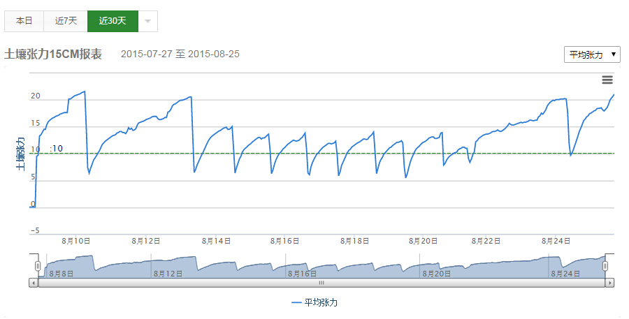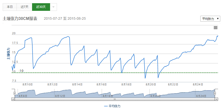 土壤張力計(jì)是現(xiàn)有高效指導(dǎo)灌溉的設(shè)備儀器。張力傳感器測的是土壤水張力,是指土壤對水的吸力,土壤愈濕,對水的吸力就愈;反之則大。當(dāng)土壤濕度增大到所有空隙充滿水時,土壤水張力將降為零。換言之,此時土壤含水率達(dá)到了飽和。