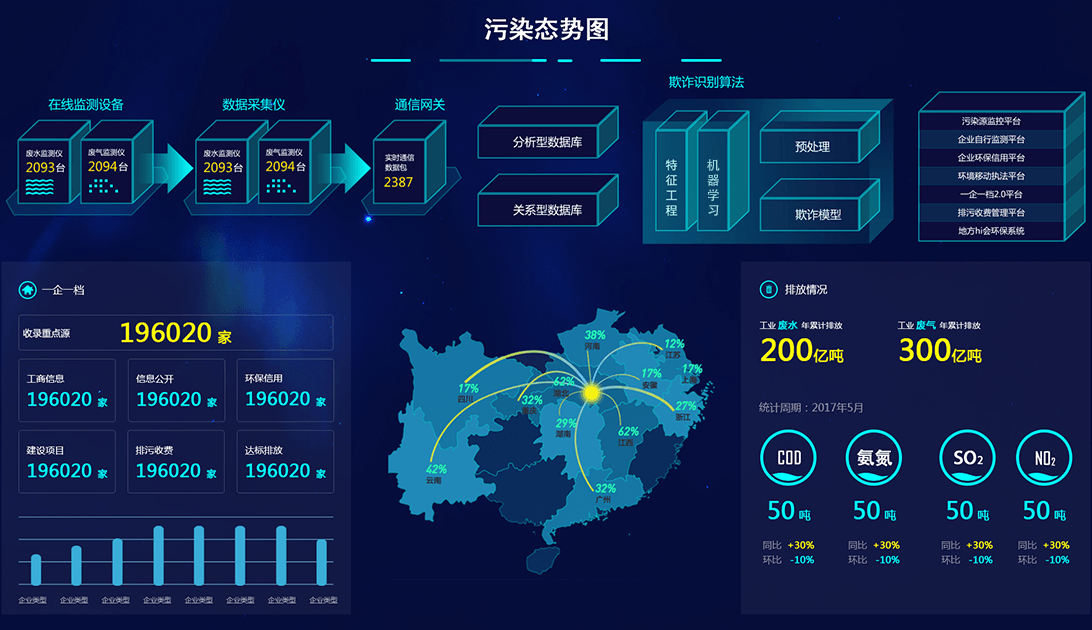 ET環(huán)境大腦提供全景式生態(tài)環(huán)境形勢研判模式,加強生態(tài)環(huán)境質量、污染源、污染物、環(huán)境承載力等數(shù)據(jù)的關聯(lián)分析和綜合研判,強化經濟社會、基礎地理、氣象水文和互聯(lián)網等數(shù)據(jù)資源融合利用和信息服務。