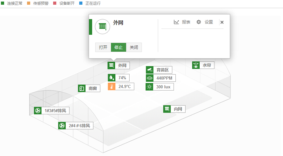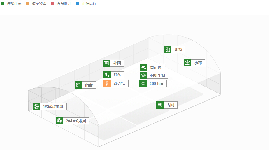 利用土壤溫度傳感器、土壤濕度傳感器、空氣溫度傳感器、空氣濕度傳感器等傳感設(shè)備實(shí)時(shí)監(jiān)測(cè)育苗中心的環(huán)境,并借助部署在關(guān)鍵監(jiān)控點(diǎn)的高清攝像頭,實(shí)時(shí)查看育苗的長(zhǎng)勢(shì)。