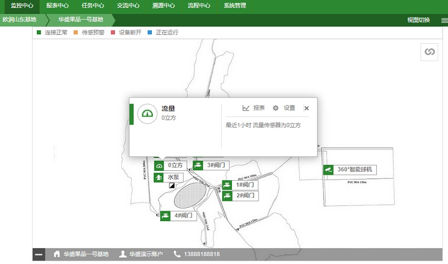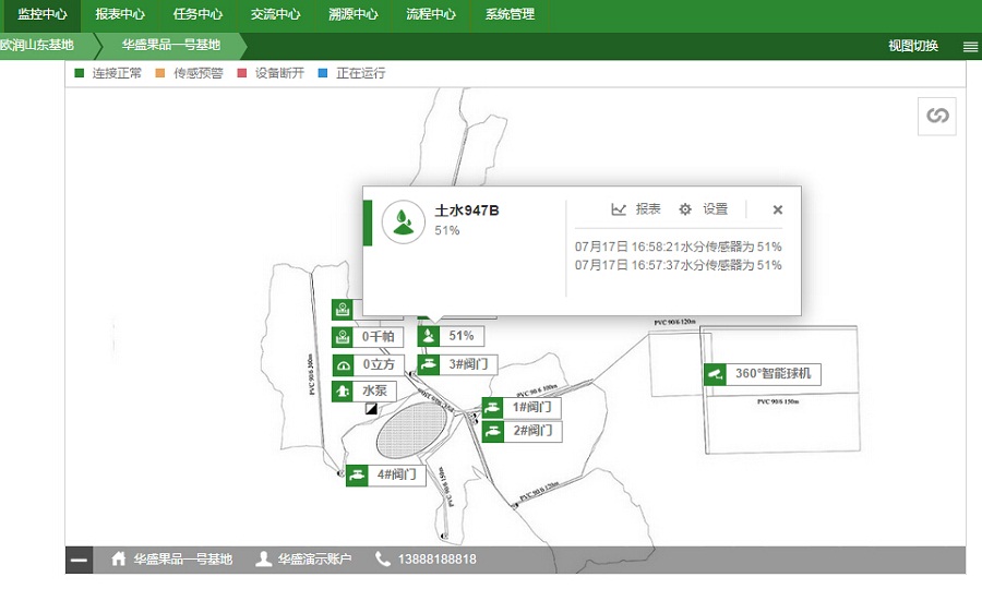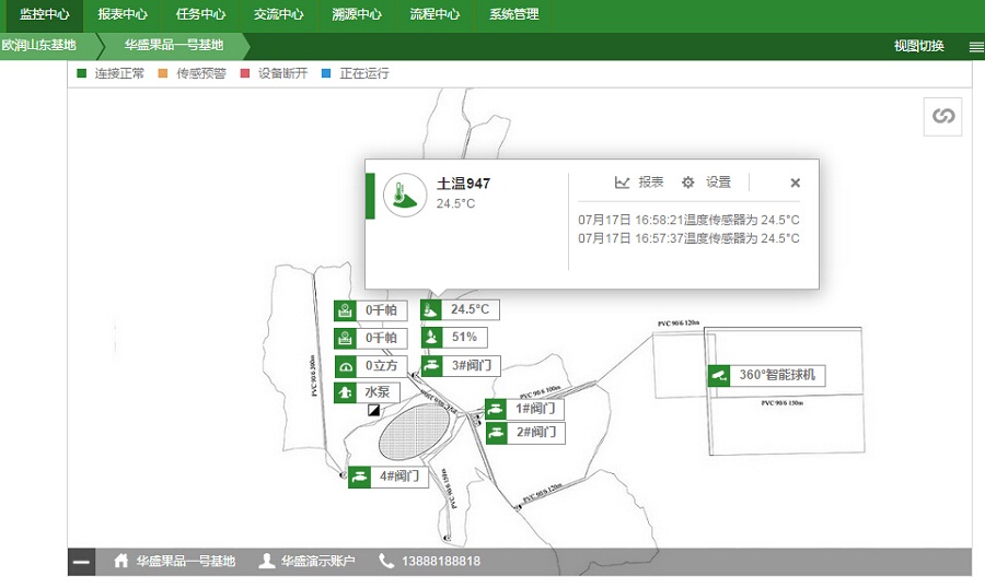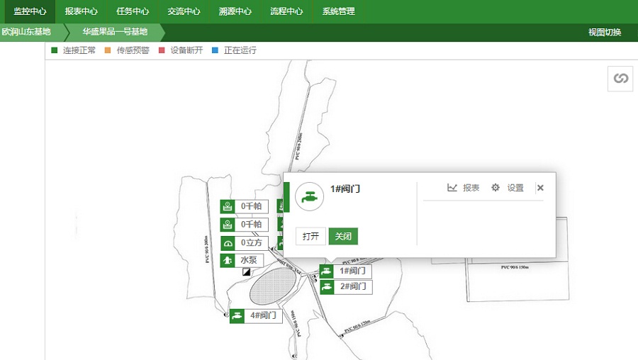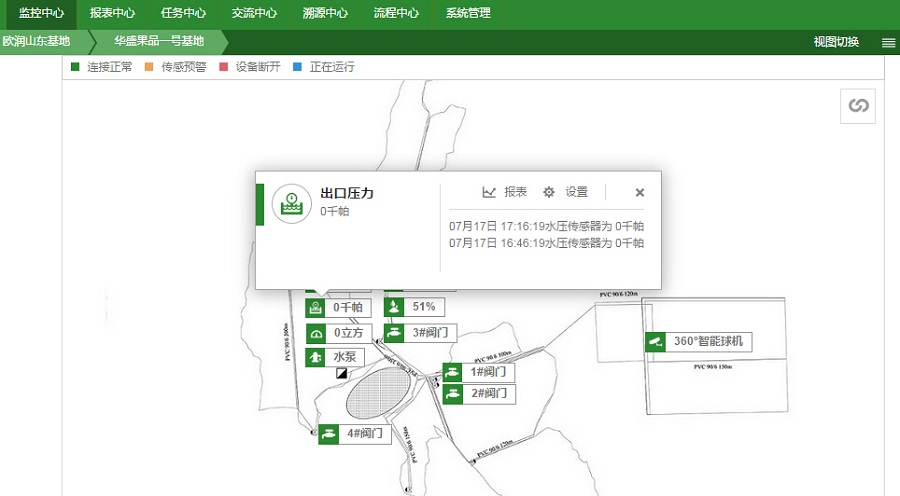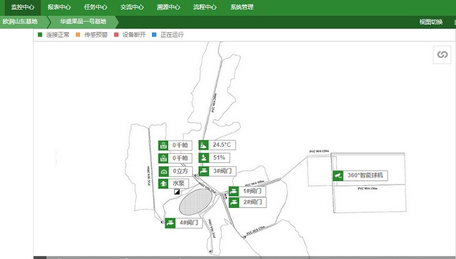 2015年華盛果品引入東山歐潤水肥灌溉一體化系統(tǒng),在園區(qū)全面部署了滴灌系統(tǒng),將園區(qū)規(guī)劃為5個獨立灌溉區(qū)域,可進行獨立灌溉作業(yè)。并借助天潤智力智慧農(nóng)業(yè)云平臺技術(shù),實現(xiàn)全自動化遠程灌溉,徹底結(jié)束傳統(tǒng)人工灌溉模式。為了能夠智能化地進行灌溉作業(yè),天潤智力智慧農(nóng)業(yè)云平臺通過傳感器監(jiān)測土壤溫濕度、360°高清視頻監(jiān)測園區(qū)灌溉情況,以及實時監(jiān)測泵房的水壓流量,讓管理員可以多維度、多角度,綜合多種數(shù)據(jù)對灌溉作業(yè)進行全面分析與掌握。