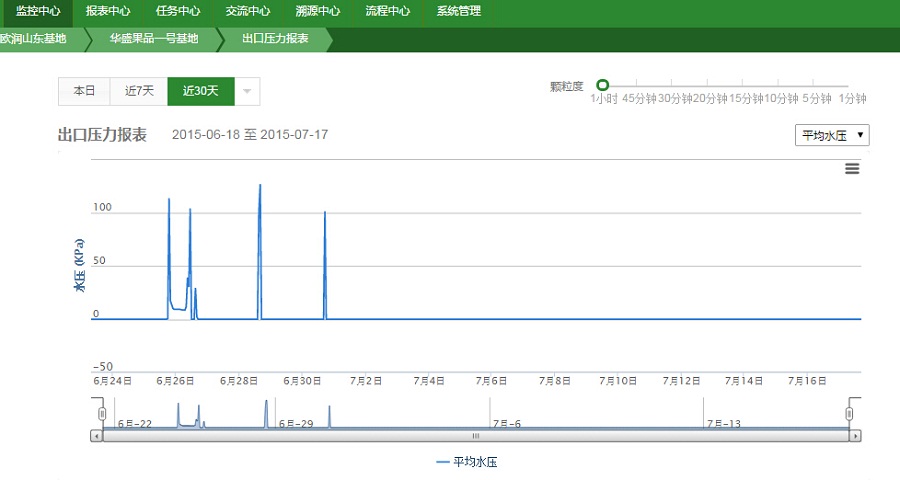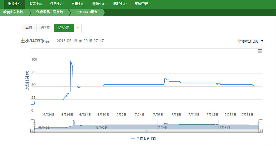 蘋果屬于需水量大的果樹,每年需要大量水分,而我國又是水資源貧乏的國家,尤其是北方地區(qū)水資源嚴(yán)重短缺,而且農(nóng)田灌溉用水占整個農(nóng)業(yè)用水的95%,因此應(yīng)用節(jié)水灌溉技術(shù)就顯得十分必要和重要。2015年6月,華盛果品承接山東沂源縣水利部農(nóng)業(yè)水價改革節(jié)水示范項目,引入歐潤的灌溉設(shè)備以及天潤智力智慧農(nóng)業(yè)云平臺技術(shù),實現(xiàn)全自動化遠程灌溉,徹底結(jié)束傳統(tǒng)人工灌溉模式。