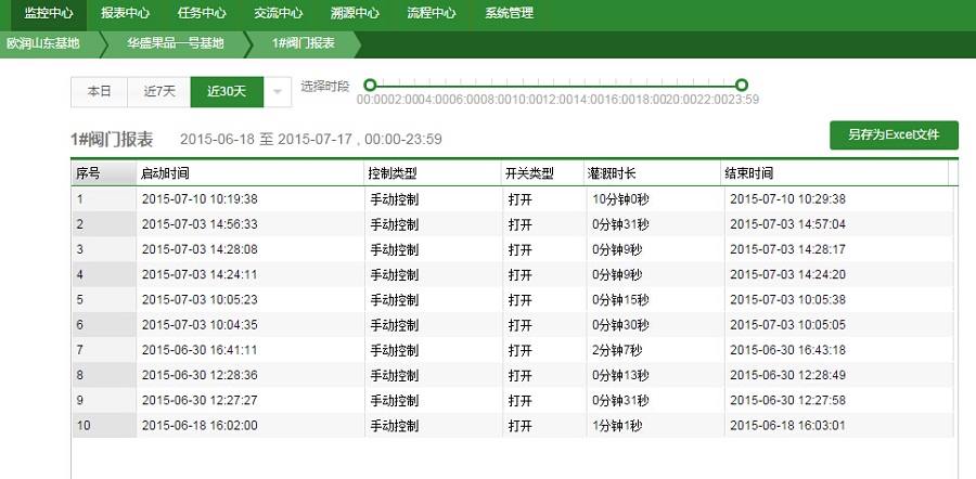 園區(qū)經(jīng)過規(guī)劃分為多個可進行獨立灌溉作業(yè)的片區(qū),通過在獨立的水泵閥門安裝控制器,工作人員通過在手機上登陸天潤智力智慧農(nóng)業(yè)云平臺就可以對各個閥門進行遠程開關(guān),隨時隨地開啟或結(jié)束灌溉作業(yè)。應(yīng)用自動灌溉設(shè)備以及天潤智力智慧農(nóng)業(yè)云平臺,給華盛果品節(jié)約了大量的灌溉人力成本,并且有效節(jié)約了用水量,提高了灌溉的效率。傳統(tǒng)的人工拉皮管灌溉,進行一次全園灌溉需要多個工人耗時約半天才能灌溉完畢,采用自動灌溉系統(tǒng)以及天潤智力智慧農(nóng)業(yè)云平臺后,只需要一個管理員和一部手機,就能輕松高效完成全園灌溉作業(yè)。