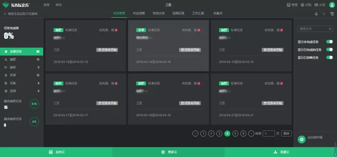 如今,五大村的蜜瓜基地在五谷耘立方標(biāo)準(zhǔn)化生產(chǎn)系統(tǒng)的管理下,井然有序地進(jìn)行著各項(xiàng)生產(chǎn)任務(wù),基層工作人員每天都會收到系統(tǒng)自動派發(fā)的農(nóng)事任務(wù)流程,以及基地管理員派發(fā)的臨時(shí)工作任務(wù),并且每完成一項(xiàng)任務(wù),工作人員在系統(tǒng)上直接匯報(bào),基地管理員在系統(tǒng)中可以實(shí)時(shí)查看工作完成情況,及時(shí)掌握農(nóng)事進(jìn)度。