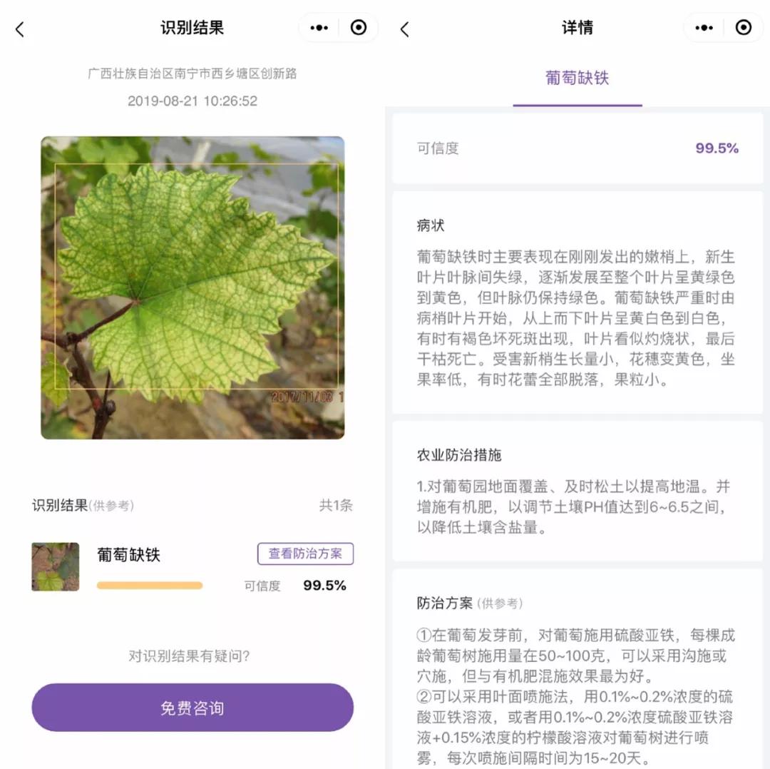 此外,葡萄園員工利用天潤智力人工智能應(yīng)用——耘眼(微信小程序/APP),只需要用手機(jī)拍攝葡萄的葉片、果實(shí)照片,就能進(jìn)行病蟲害識別,從而獲得對應(yīng)的防治措施和用藥方案。目前,耘眼基于上萬張樣本量,能夠識別幾十種陽光玫瑰葡萄常見病蟲害,識別準(zhǔn)確率達(dá)98%以上。