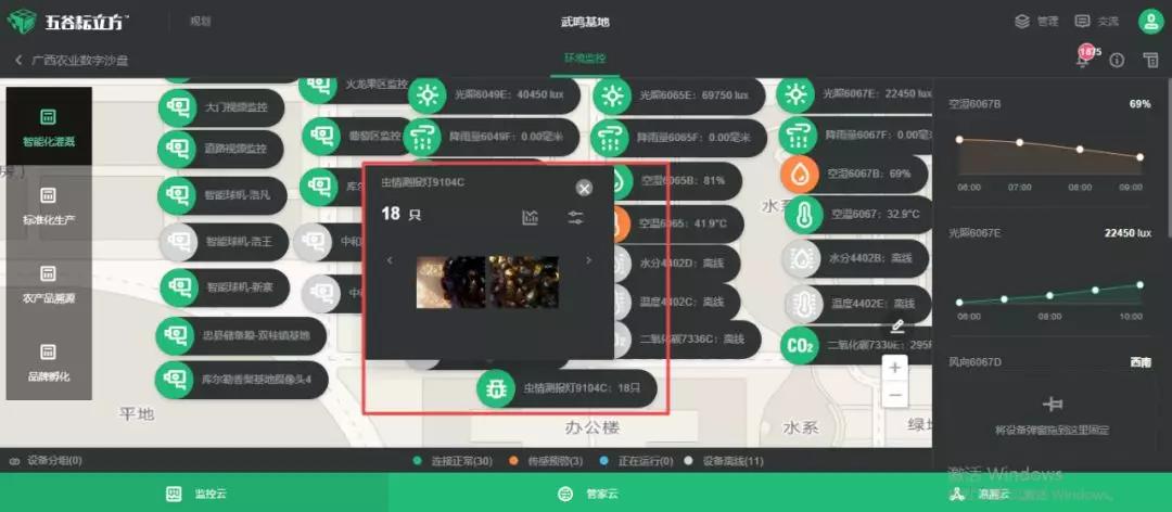 天潤智力在試驗(yàn)站內(nèi)安裝了智能蟲情測報(bào)燈,在害蟲出沒高峰期進(jìn)行誘蟲捕獲并拍照。通過系統(tǒng)遠(yuǎn)程查看接蟲盒內(nèi)的蟲子情況,實(shí)現(xiàn)區(qū)域的病蟲害監(jiān)測和害蟲類別的自動(dòng)分類和計(jì)數(shù),當(dāng)系統(tǒng)監(jiān)測到接蟲盒內(nèi)的蟲子數(shù)量超過預(yù)設(shè)的數(shù)量時(shí),系統(tǒng)會(huì)自動(dòng)預(yù)警,提醒用戶此時(shí)為蟲害高發(fā)期,應(yīng)及時(shí)防治。