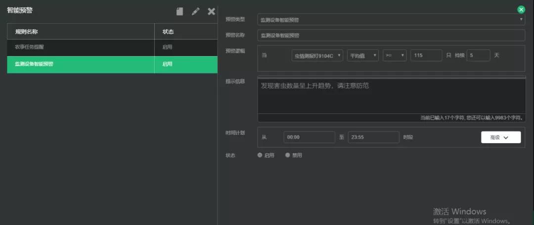 為了預(yù)防天氣突變帶來的意外災(zāi)害,以往的葡萄園員工必須設(shè)置鬧鐘,定時(shí)定點(diǎn)去葡萄園內(nèi)巡查,這對于員工來說是一個(gè)低效率又極其耗費(fèi)時(shí)間精力的工作。而通過智能預(yù)警系統(tǒng),可以實(shí)現(xiàn)未來24小時(shí)異常氣象預(yù)警,并且當(dāng)傳感器監(jiān)測到的數(shù)據(jù)超過或者低于臨界值時(shí),系統(tǒng)就會(huì)自動(dòng)發(fā)出預(yù)警并自動(dòng)啟動(dòng)對應(yīng)設(shè)備,同時(shí)聯(lián)動(dòng)到上級管理員,遠(yuǎn)程指揮防御措施。