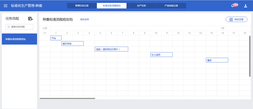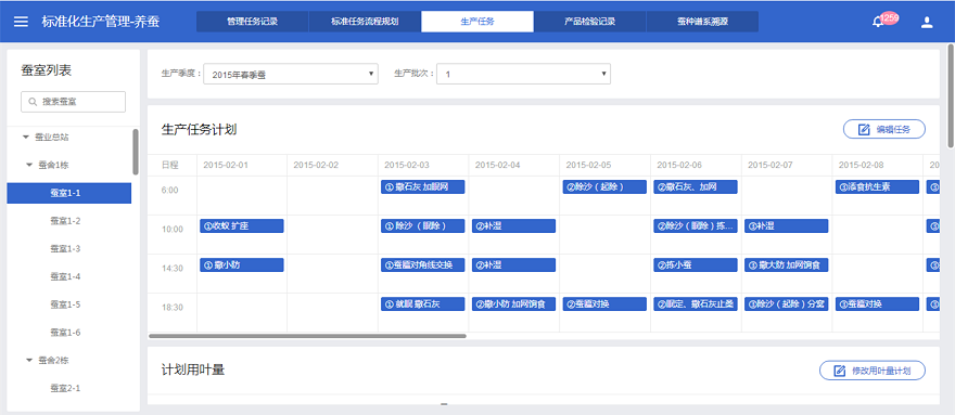 桑蠶養(yǎng)殖周期短,各生理階段生長變化快,工藝流程復雜繁多,且鑒于蠶業(yè)總站蠶種繁育數(shù)量多,每批蠶種的繁育階段有一定差異,這意味著工作人員必須熟記每個蠶室的生產(chǎn)進度,并嚴格做好工作記錄,一旦工作有所疏忽,則會造成繁育生產(chǎn)進度紊亂,嚴重則會對整體運營管理包括桑園種植、噴藥、采摘,以及其他蠶室生產(chǎn)造成一系列聯(lián)動影響。智能桑蠶種養(yǎng)物聯(lián)網(wǎng)系統(tǒng)平臺根據(jù)蠶種繁育的生產(chǎn)需求,制定了規(guī)范標準化的蠶種生產(chǎn)流程,這一標準化生產(chǎn)流程具體到全生產(chǎn)周期,每一個繁育階段,每天、每小時的蠶種繁育生產(chǎn)任務,如投食、消毒等。每個蠶室在開展本周期蠶種繁育生產(chǎn)時,可在平臺上啟動相應蠶室的標準化生產(chǎn)流程,一旦流程啟動,工作人員手機則會收到平臺自動發(fā)送的生產(chǎn)任務,進而根據(jù)提示完成任務并在平臺上完成任務匯報。如有特殊情況導致生產(chǎn)進度發(fā)生變化,工作人員可以根據(jù)實際情況在平臺上進行自動調(diào)整,繼而根據(jù)標準化生產(chǎn)流程開展蠶種繁育。與此同時,管理人員能夠?qū)崿F(xiàn)對整個蠶廠的整體生產(chǎn)運營進行全程跟蹤和追溯,快速發(fā)現(xiàn)問題以及將責任落到明確的工作人員身上,不僅實現(xiàn)對蠶種養(yǎng)殖的管理,也實現(xiàn)了對人員的有效管理。
