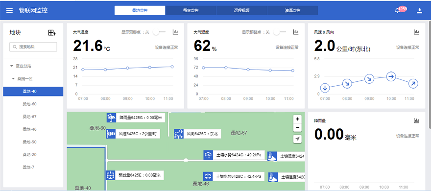 智能桑蠶種養(yǎng)物聯(lián)網(wǎng)系統(tǒng)平臺首先從智能化監(jiān)控管理入手,通過在桑園,以及96個蠶室部署智能物聯(lián)網(wǎng)設備,實現(xiàn)對桑地環(huán)境、蠶室環(huán)境的實時、自動、精準監(jiān)控,推行桑蠶生產(chǎn)全生產(chǎn)周期智能化監(jiān)控,將以前耗費大量人力物力完成的日常環(huán)境監(jiān)測事務交給智能桑蠶種養(yǎng)物聯(lián)網(wǎng)系統(tǒng)平臺自動完成。譬如,通過物聯(lián)網(wǎng)設備自動監(jiān)控每個蠶室的空氣溫濕度,工作人員只需要在智能手機或者電腦上登錄智能桑蠶養(yǎng)殖平臺,就能夠隨時隨地查看96個蠶室的空氣溫濕度;同時可以根據(jù)蠶室的最佳溫度進行預警設置,如當蠶室的溫度低于設定的20℃時,蠶室管理員手機則會收到相關蠶室的低溫預警信息,進而可以及時采取增溫措施,避免因持續(xù)低溫造成損失。全生產(chǎn)周期智能監(jiān)控不僅節(jié)約了大量的人力成本,還降低了因突發(fā)異常導致的生產(chǎn)風險。