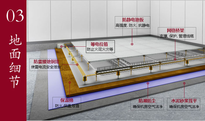 ( 1)地板采用高強(qiáng)度的抗靜電地板,它拆卸靈活、互換性能好,能提供靜壓風(fēng)庫(kù),抗御靜電荷等優(yōu)點(diǎn),可用于任何管線敷設(shè)集中,防止靜電產(chǎn)生的場(chǎng)所。 防止和消除機(jī)房的靜電積沉,是保證計(jì)算機(jī)安全可靠運(yùn)行和消除操作人員安全心理障礙的主要技術(shù)之一,防靜電活動(dòng)地板是實(shí)現(xiàn)這種技術(shù)的有效設(shè)施。2)因機(jī)房在精密空調(diào)的作用下處于恒溫恒濕的狀態(tài)下,鋪20mmPE防火保溫板有效地防止地板下結(jié)露現(xiàn)象的產(chǎn)生。 3)為防止止機(jī)房?jī)?nèi)精密空調(diào)漏水事故,特要求增設(shè)防水墻一道及地漏,并在其四周鋪設(shè)漏水感應(yīng)設(shè)備能夠及時(shí)的發(fā)現(xiàn)水患的存在并避免水患的擴(kuò)大。)