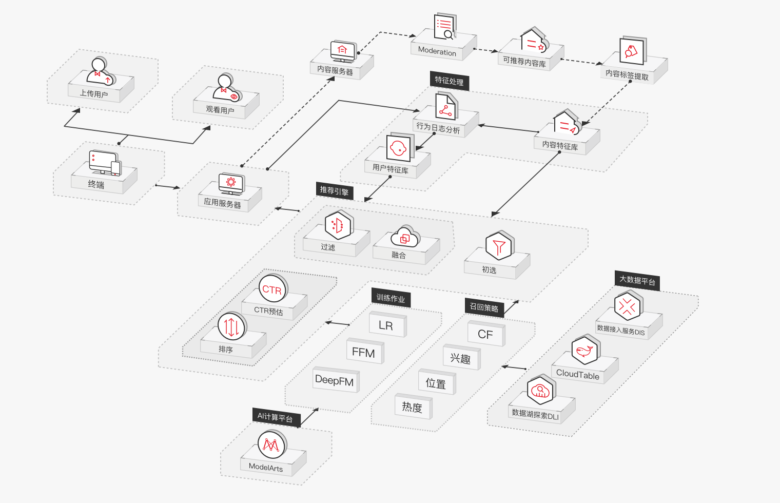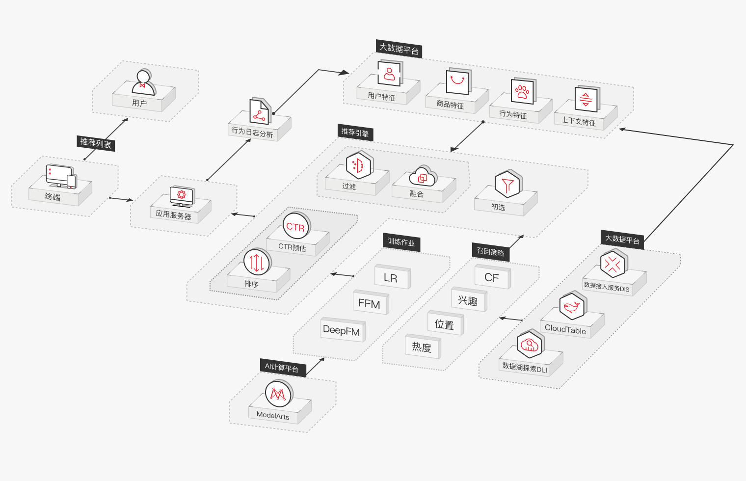 根據(jù)用戶海量訪問、交易等數(shù)據(jù),利用高性能分布式推薦算法,全方位分析用戶各種行為之間的關聯(lián)性;支持千萬維度特征,分鐘級模型更新