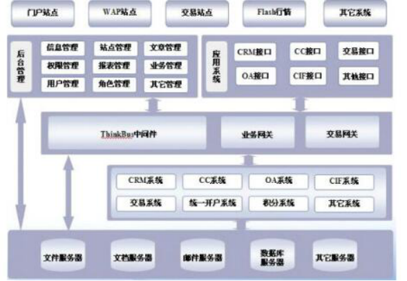 一般來說,證券公司現(xiàn)有的網(wǎng)站系統(tǒng)都包括交易系統(tǒng),CRM系統(tǒng),咨詢數(shù)據(jù)庫,OA辦公等資源進入網(wǎng)站,通過ThinkBus中間技術(shù)來實現(xiàn)這一過程。