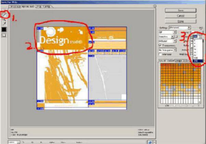 我們來看看紅線所標識的1.2.3部分,將1所示的切片工具選中,然后點選2所示的圖片,在3所示的地方選擇色值,如果色彩單一可以選擇盡量小的色值位;設置好之后輸出文件,文件里包括htm和image的文件夾。到這里頁面就算完成一半。