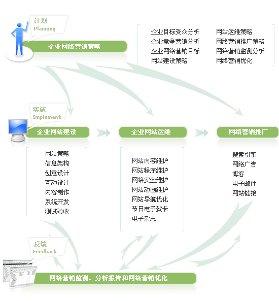 北京網(wǎng)站建設(shè)中心提供全面的企業(yè)網(wǎng)絡(luò)營銷解決方案,解決方案的實施包括三個階段:計劃階段、實施階段、反饋階段。在計劃階段,我們首先確定客戶企業(yè)網(wǎng)絡(luò)營銷目標,通過對客戶目標受眾和競爭對手營銷調(diào)研分析,制定出適合客戶的網(wǎng)絡(luò)營銷實施策略。網(wǎng)絡(luò)營銷實施策略不僅僅包括網(wǎng)站建設(shè)策略,還包括網(wǎng)站的運維策略、網(wǎng)絡(luò)營銷推廣策略、網(wǎng)絡(luò)營銷監(jiān)測分析、網(wǎng)絡(luò)營銷優(yōu)化等。在實施階段,我們會根據(jù)制定好的網(wǎng)路營銷實施策略進行網(wǎng)站建設(shè)、網(wǎng)站運維以及網(wǎng)絡(luò)營銷推廣。反饋階段與實施階段是同時進行的,在網(wǎng)站建設(shè)、網(wǎng)站運維和網(wǎng)絡(luò)營銷推廣過程中,我們會根據(jù)網(wǎng)絡(luò)營銷監(jiān)測系統(tǒng)搜集的數(shù)據(jù)進行詳細的分析,為客戶提供網(wǎng)絡(luò)營銷監(jiān)測分析報告,并提供可行性的網(wǎng)絡(luò)營銷策略優(yōu)化建議。